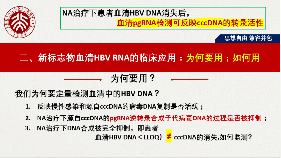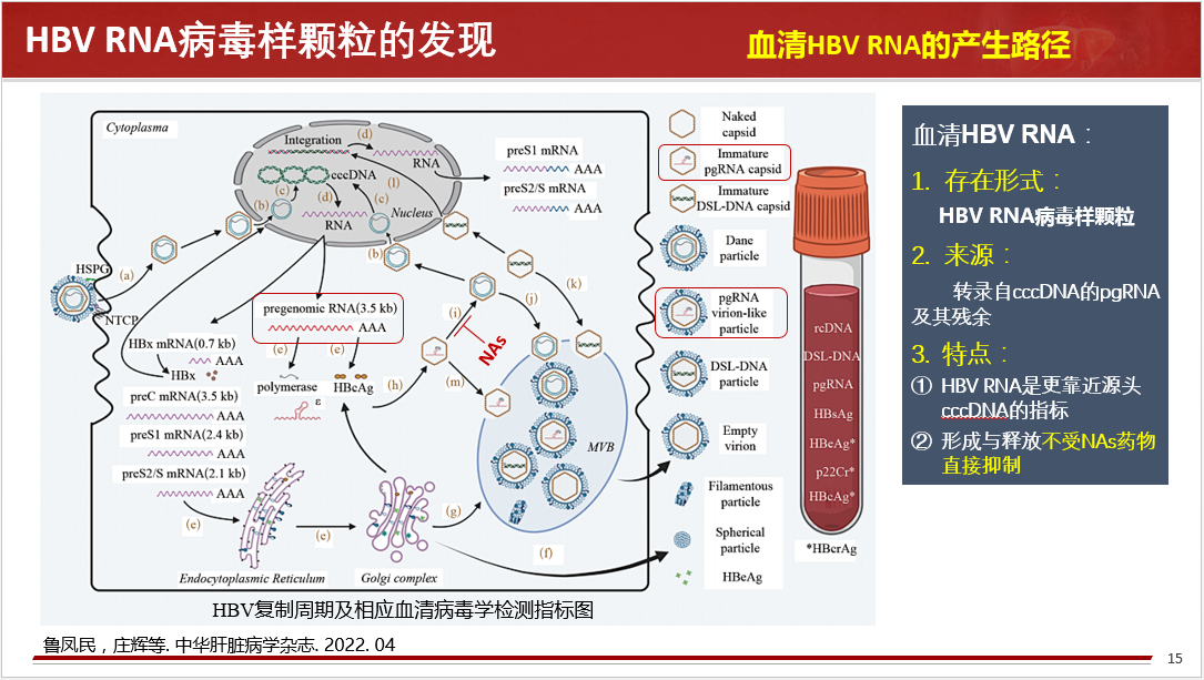 关于HBV RBA病毒样颗粒的发现、血清HBV RNA的产生路径、存在形式、来源和特点等做了详细阐述,同时分享国内肝病领域张文宏研究团队等工作成果,血清HBV RNA水平反映肝内cccDNA的转录活性,血清 HBV pgRNA,是NA治疗下HBV DNA < LLOQ后,能够反映患者肝组织内是否有cccDNA活跃转录的唯一指标。