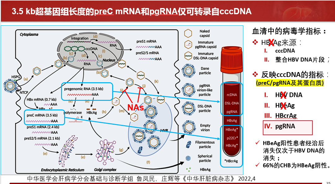 当前常用的病毒学指标HBsAg的来源除了cccDNA以外还有整合HBV DNA片段,只有3.5kb超基因组长度的preC mRNA和pgRNA仅可转录自cccDNA,因而能反映cccDNA的指标为pgRNA和HBcrAg。
