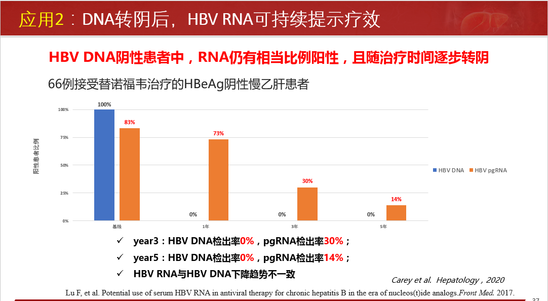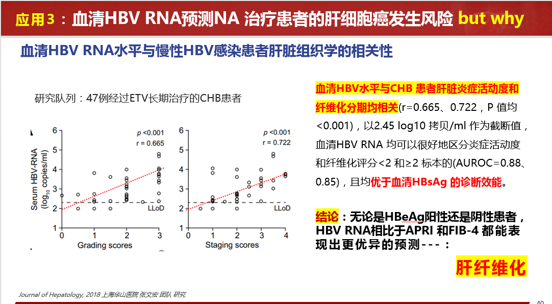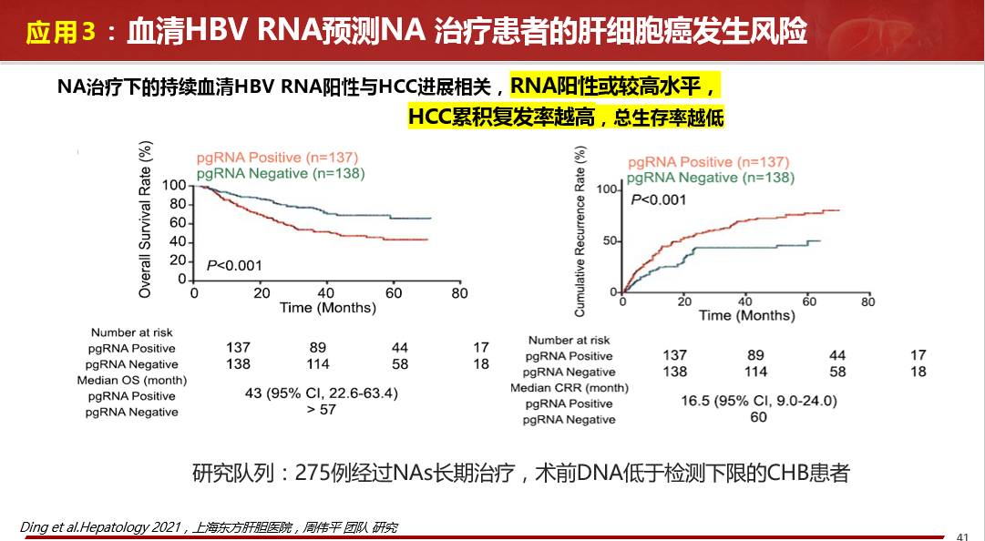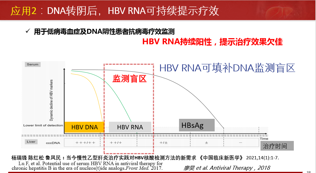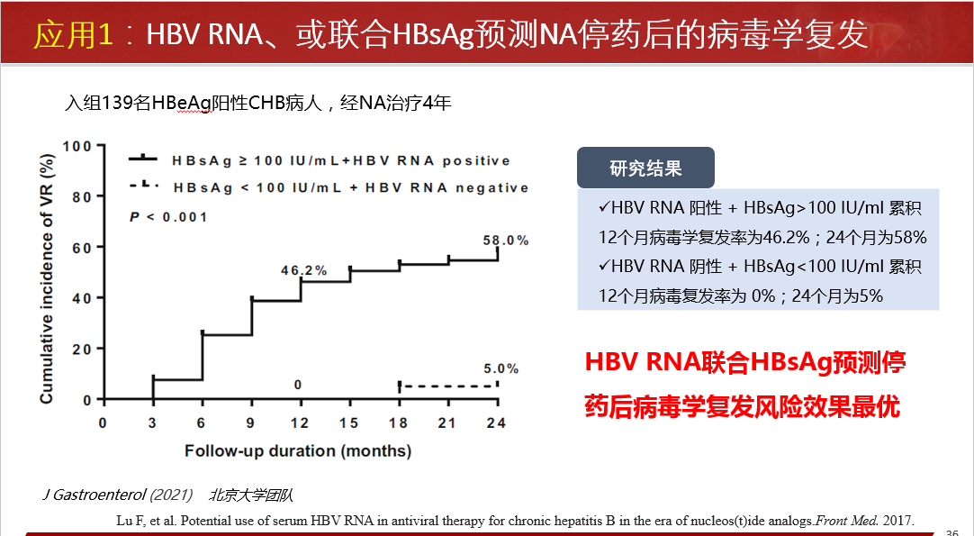 临床应用方面:指导安全停药;NA治疗下患者血清HBV RNA检测阳性预示更高的HCC发生风险;NA治疗下患者血清HBV RNA检测阳性,提示病毒cccDNA仍在有效转录表达病毒蛋白、组装子代病毒颗粒样pgRNA病毒颗粒。